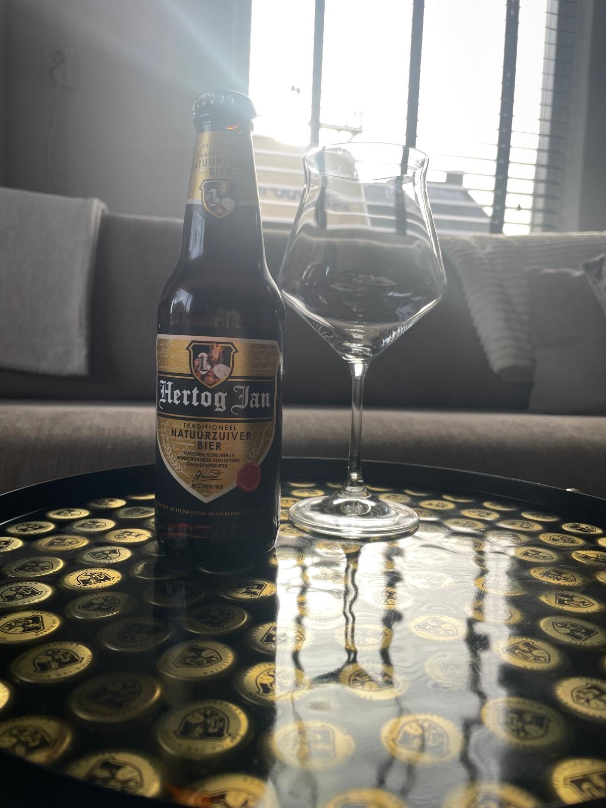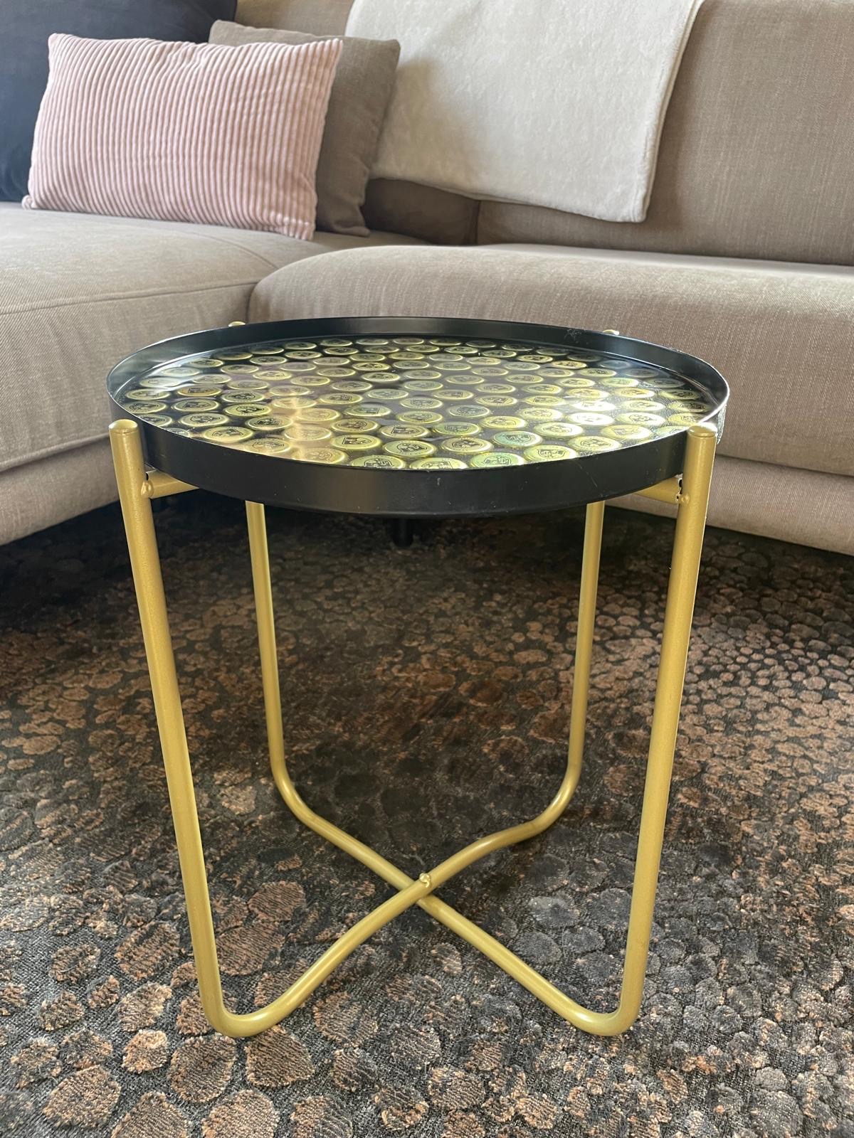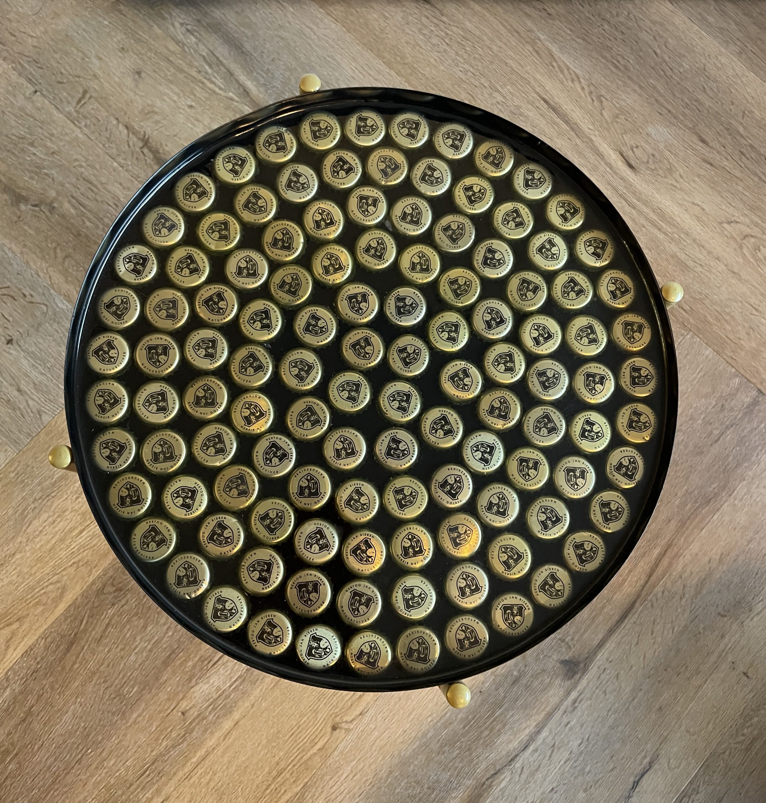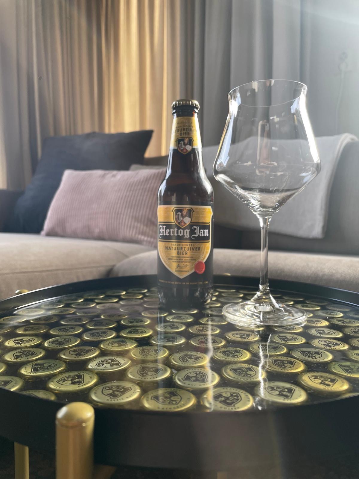 Voor de échte Hertog Jan liefhebber. Een ronde bijzettafel met gouden onderstel. Ingelegd met Hertog Jan bierdopjes en afgegoten met epoxy voor een strakke look.