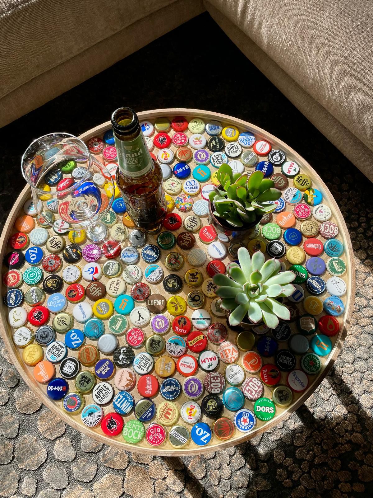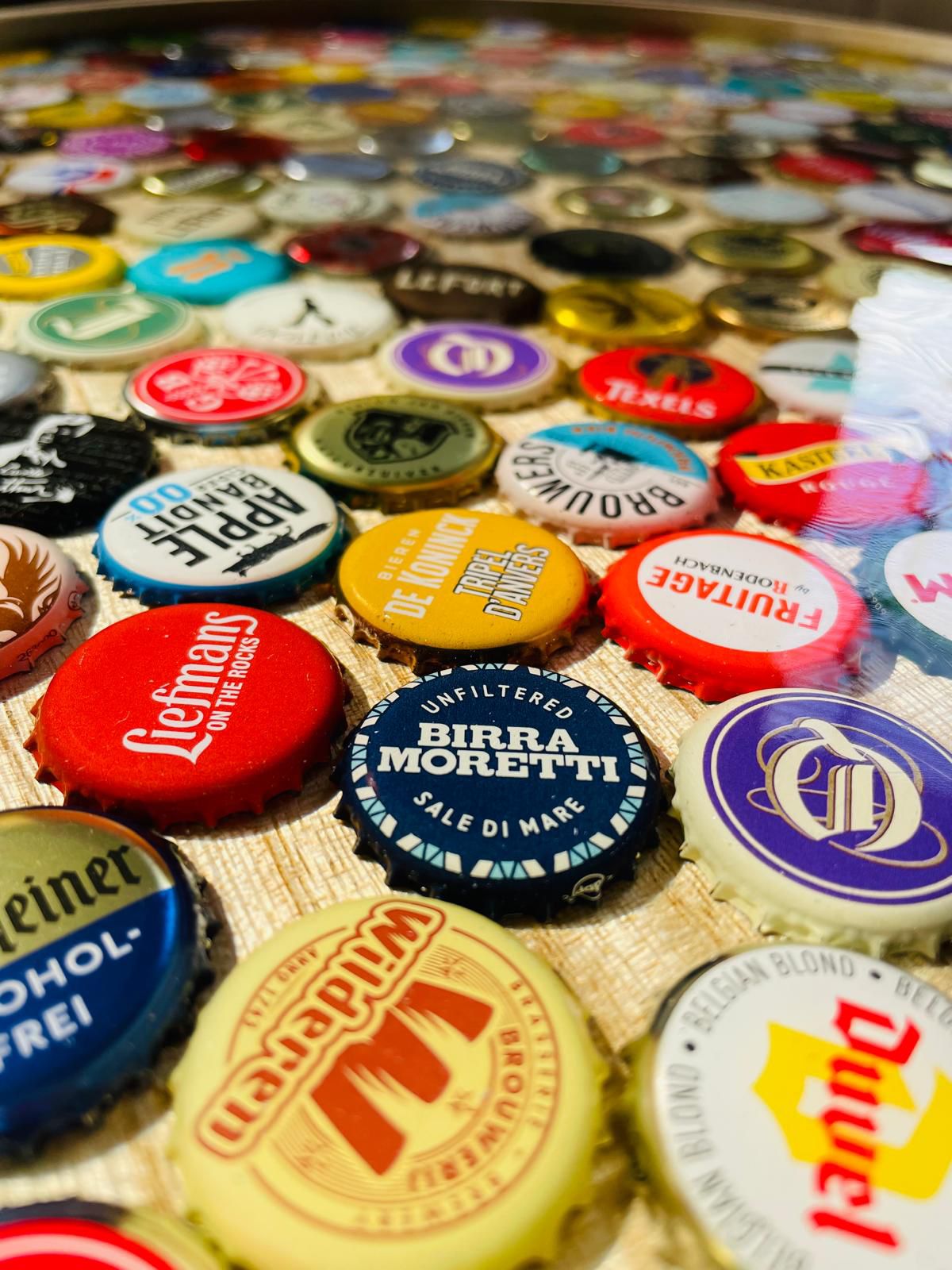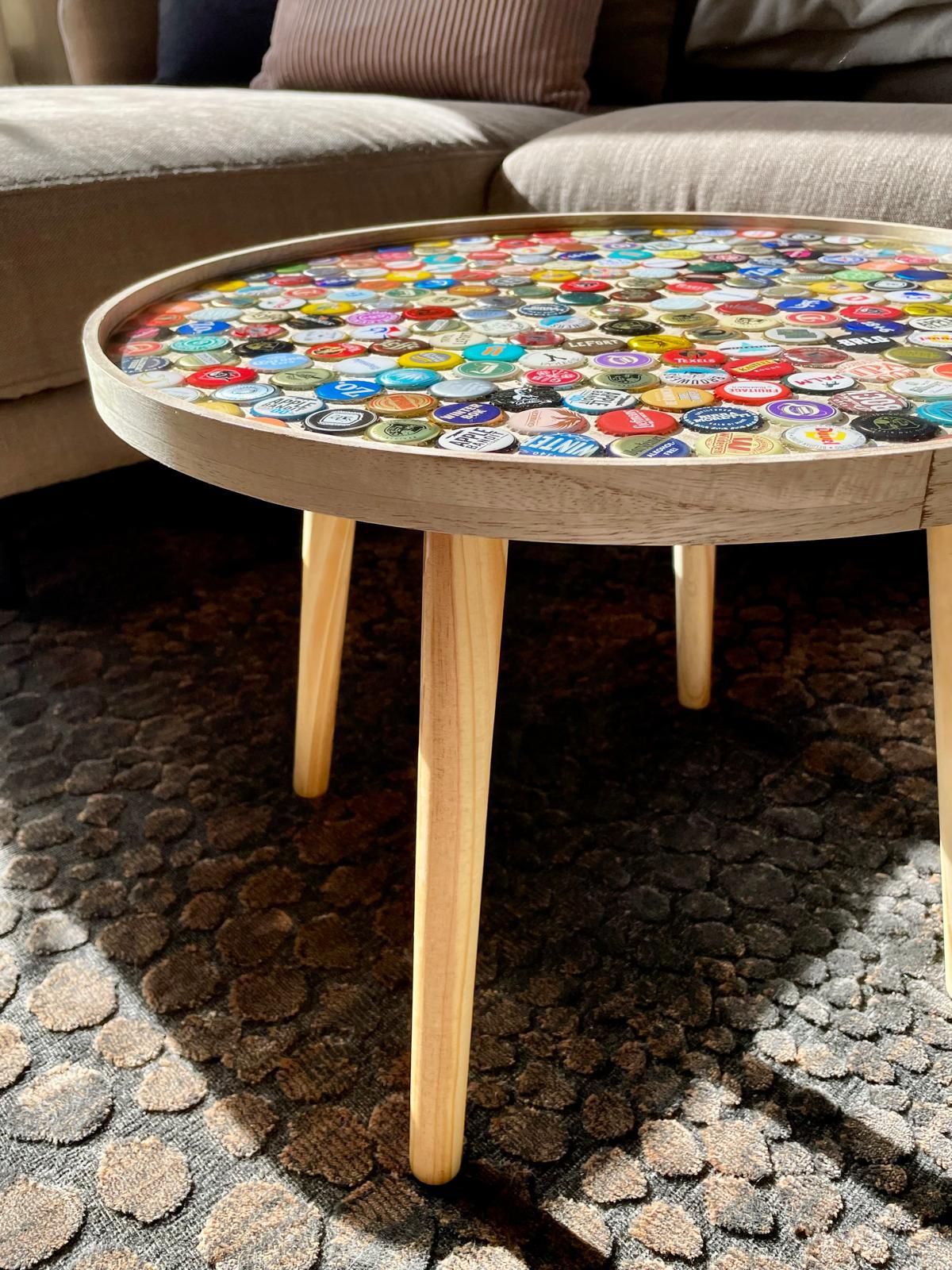 Voor deze bijzettafel is een selectie gemaakt van verschillende (speciaal)bieren. Gegoten met epoxy voor een strakke look.